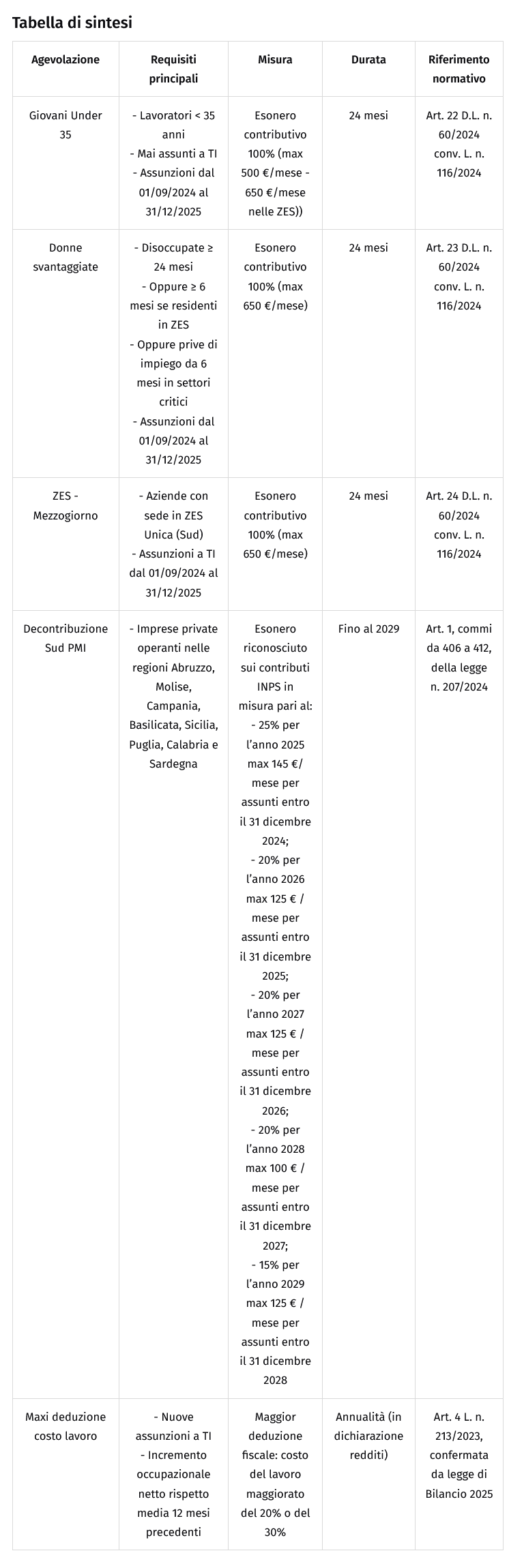 Lo stesso decreto Coesione ha rafforzato anche il sostegno all’occupazione nelle Zone Economiche Speciali (ZES) del Mezzogiorno: Campania, Calabria, Puglia, Basilicata, Sicilia, Sardegna, Molise e Abruzzo. Le imprese che assumono a tempo indeterminato in queste aree tra il 1° settembre 2024 e il 31 dicembre 2025 beneficiano di un esonero contributivo integrale, fino a 650 euro al mese, per 24 mesi (Art. 24 D.L. n. 60/2024 - decreto 7 gennaio 2025 - INPS, circolare n. 90/2025).