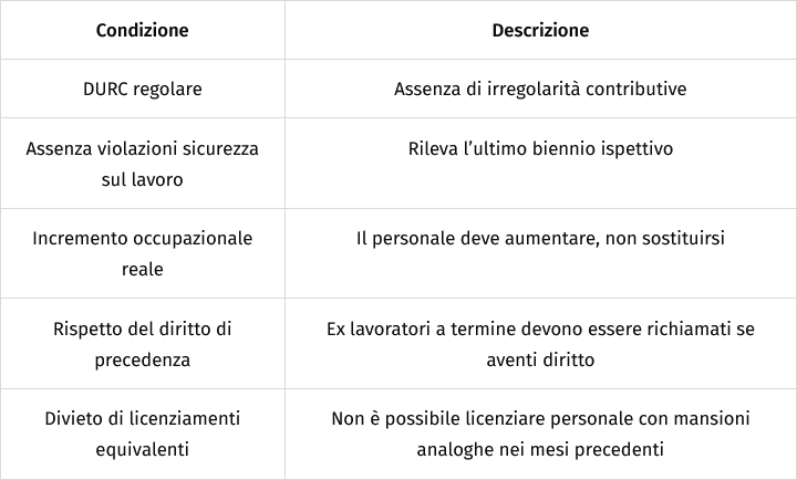 L’accesso al beneficio è subordinato al rispetto di una serie di requisiti, destinati a garantire che lo sgravio si traduca in effettiva stabilizzazione e non in sostituzione impropria di personale: